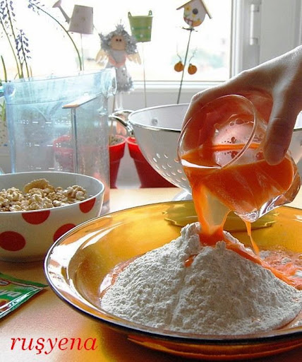 Kitabım gelinceye dek ise tam buğday unu ile yapabileceğim ekmek tarifleri peşine düştüm. Okuduğum bir kaç tarif arasında aklımı çelen tarif "dokuzuncubulut blogu"ndaki "havuçlu ekmek" tarifi oldu. Ben tarifin adını değiştirdim... İçinde havuç suyuyla birlikte ceviz de olduğu için "havuçlu, cevizli ekmek" koydum. Unuttuğum bir nokta ve bilerek uygulamadığım bir iki şey dışında tarife tamamen sadık kaldım. Bu noktalara ekmeğin yapılış aşamasını anlatırken değineceğim...