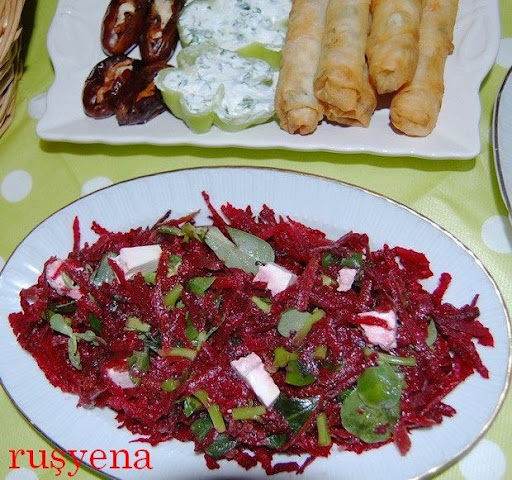 Rendelenmiş kırmızı pancar, iri kıyılmış semizotu ve keçi peyniri kırıntılarını yağ-limon-tuz karışımıyla sağlıklı bir salataya dönüştürdüm.